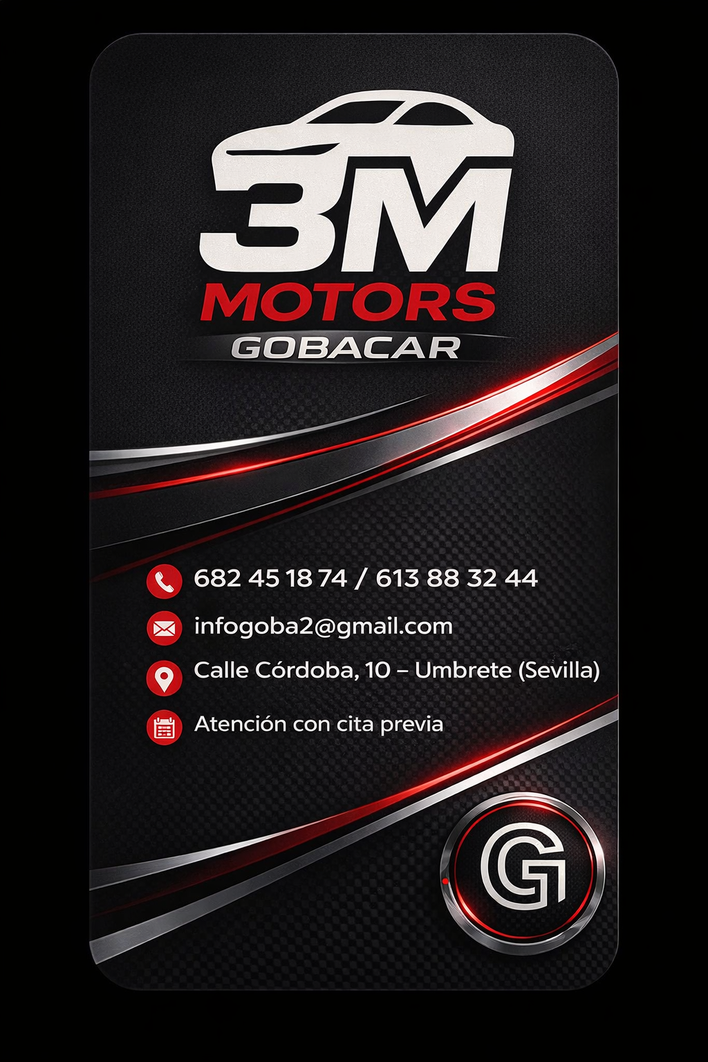 3M Motor Gobacars, gestionado por Ismael y Miguel, es un negocio especializado en la compra y venta de vehículos en Umbrete, dirigido a clientes de toda la comarca del Aljarafe y Sevilla.